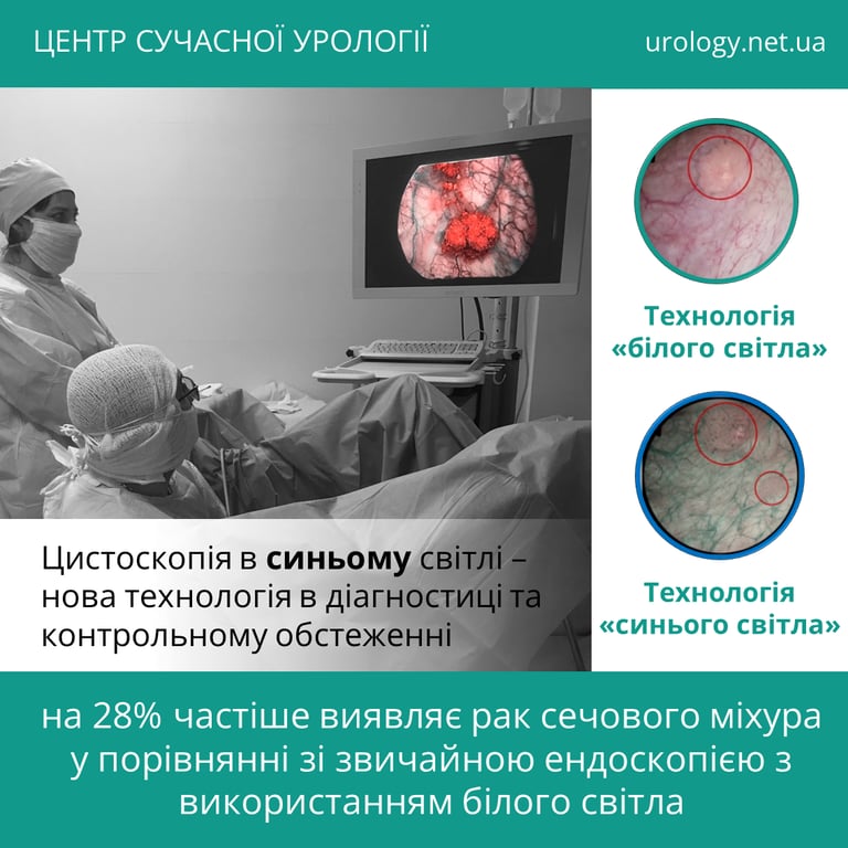 Новим стандартом в діагностиці та контрольному обстеженні раку сечового міхура є цистоскопія «в синьому світлі», яку використовують в сучасних медичних центрах, зокрема в «Центрі сучасної урології» в Києві ⬥ Крюківщині.
