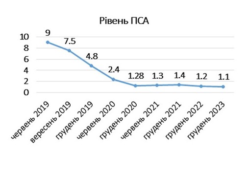 Протягом двох років спостереження рівень ПСА знизився з 9 нг/мл до 1,1 нг/мл, що є нормальним показником для пацієнтів цього віку.
