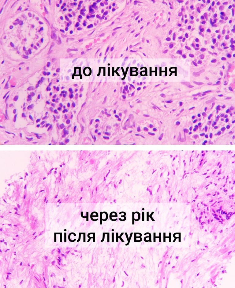 Повторна біопсія підтвердила наявність чітко окресленої ділянки склерозу в зоні проведеного лікування без ознак злоякісного процесу.